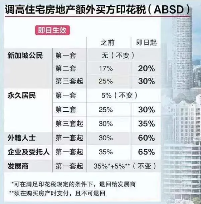 外国人购买新加坡住宅需要缴纳60%印花税,用公司名义购买住宅需要缴纳65%印花税。