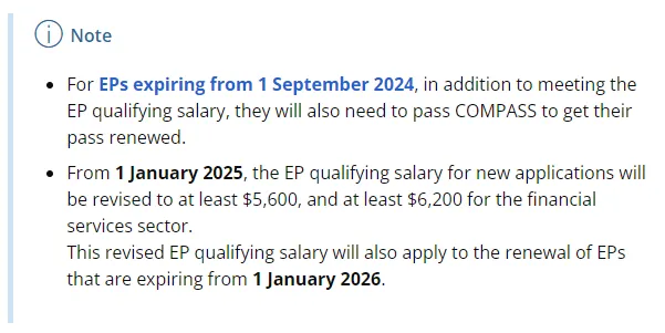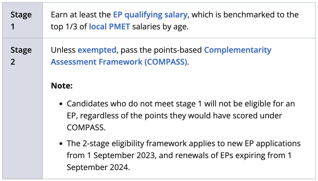 最新规定:对于持有新加坡EP准证的持有人从24年9月1日起续签,需要满足新的工资标准及COMPASS打分要求(40分)。