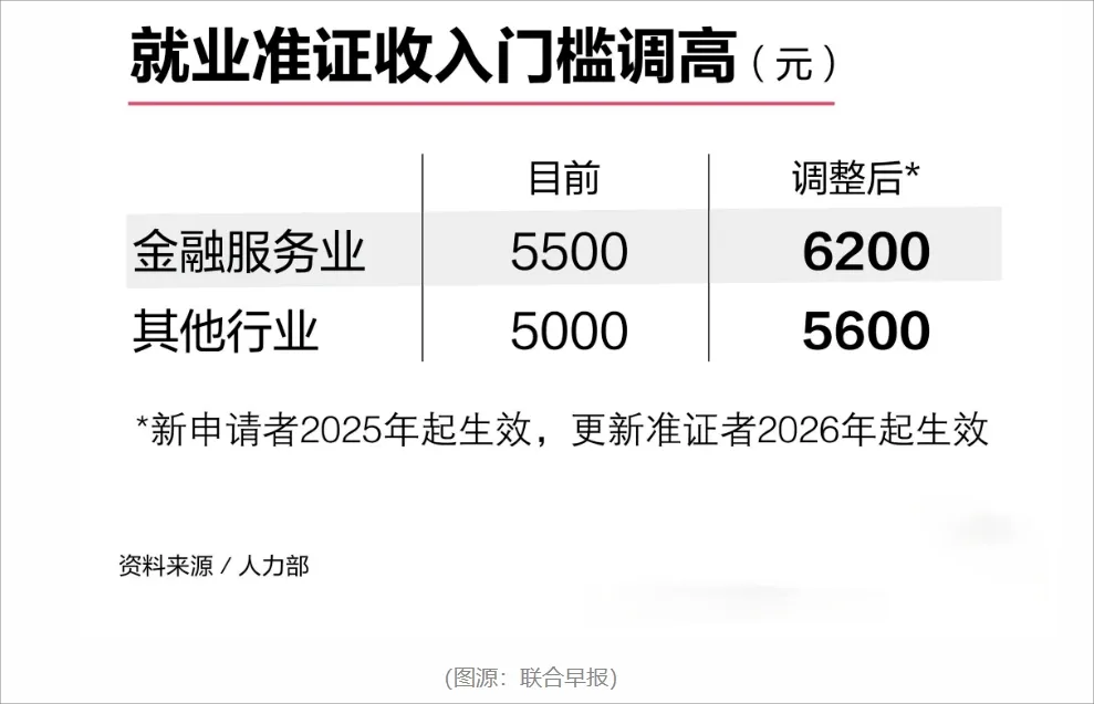 不同年龄段、不同行业的薪资要求有所不同,从2025年开始,对于经验较少的专业人士,其他行业最低薪资要求月薪从5000新元上涨至5600新元,金融服务行业月薪从5500新元上涨至6200新元。