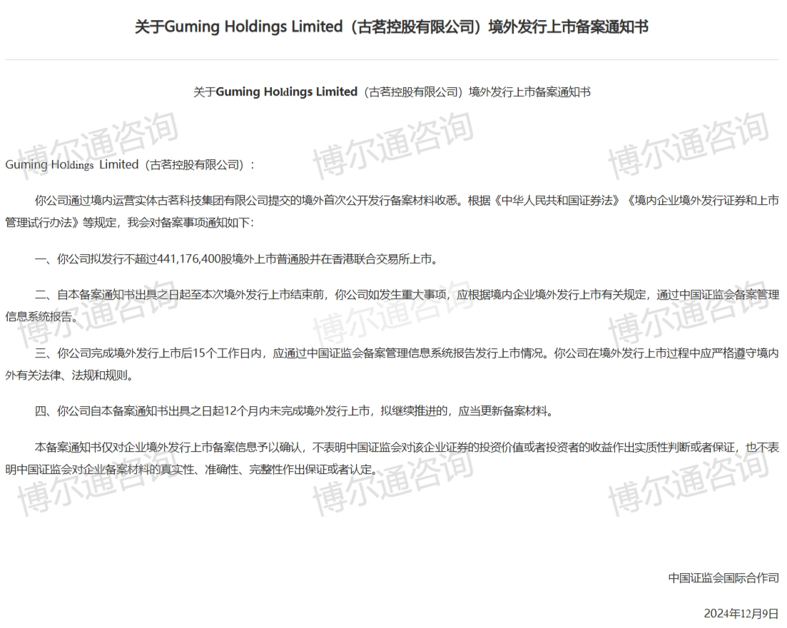12月9日,中国证监会对古茗控股境外发行上市备案予以确认,该公司为拟赴港上市企业,至此,共111家赴港上市企业完成备案。