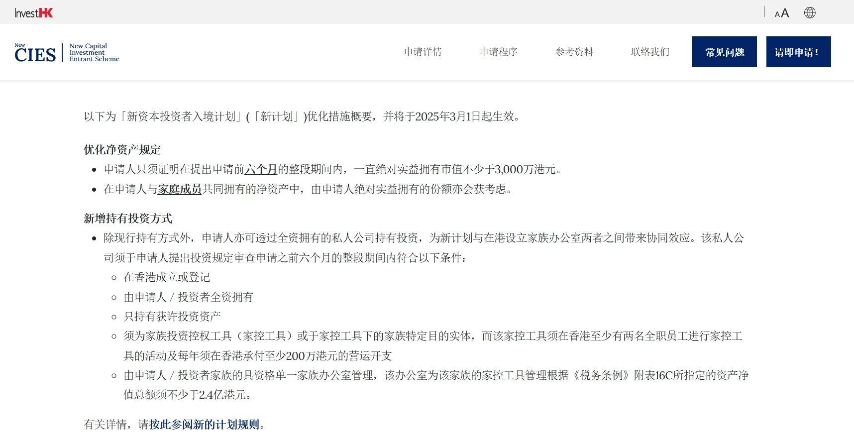 01新资本投资者入境计划新政要点①缩短净资产审查时间只须证明在提出净资产审查申请日期前6个月(优化前为两年)的整段期间内,一直绝对实益拥有市值不少于3000万港元的净资产或净资本。