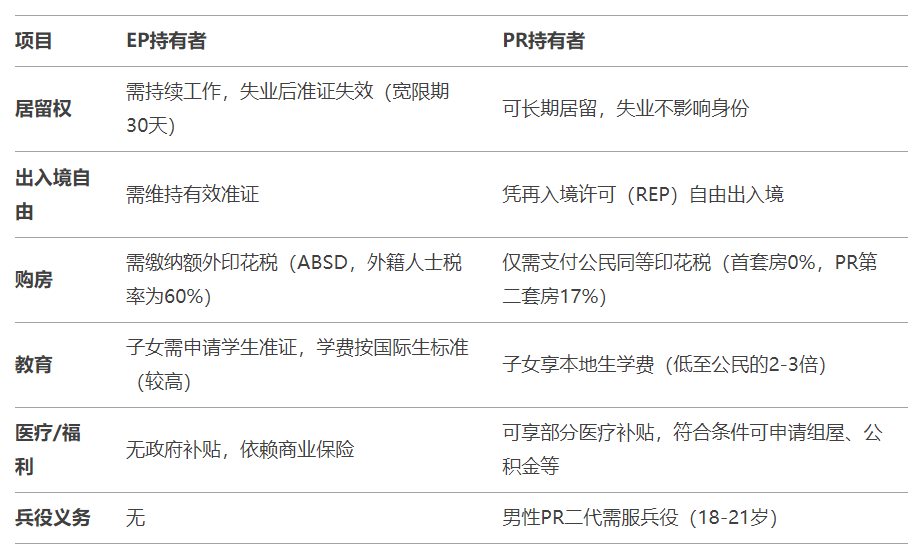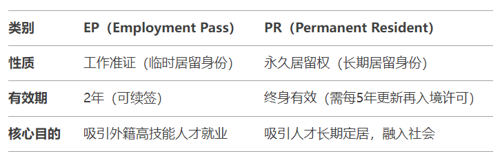 04新加坡EP与PR1.身份性质EP:是新加坡为外国专业人才提供的工作许可,属于工作签证性质,允许持有者在新加坡为特定雇主工作。