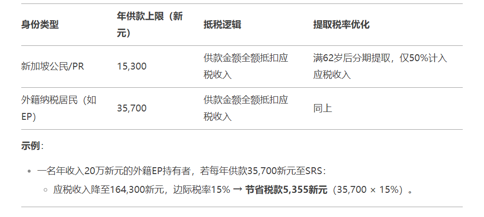 01新加坡SRS计划的作用 一、供款抵税SRS的最大吸引力在于其供款可直接抵扣个人所得税。不同身份的供款上限不同:
